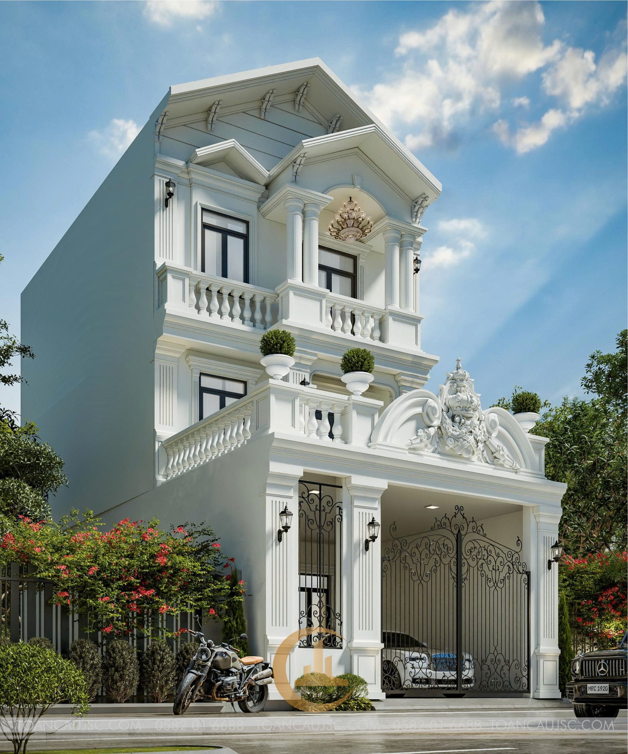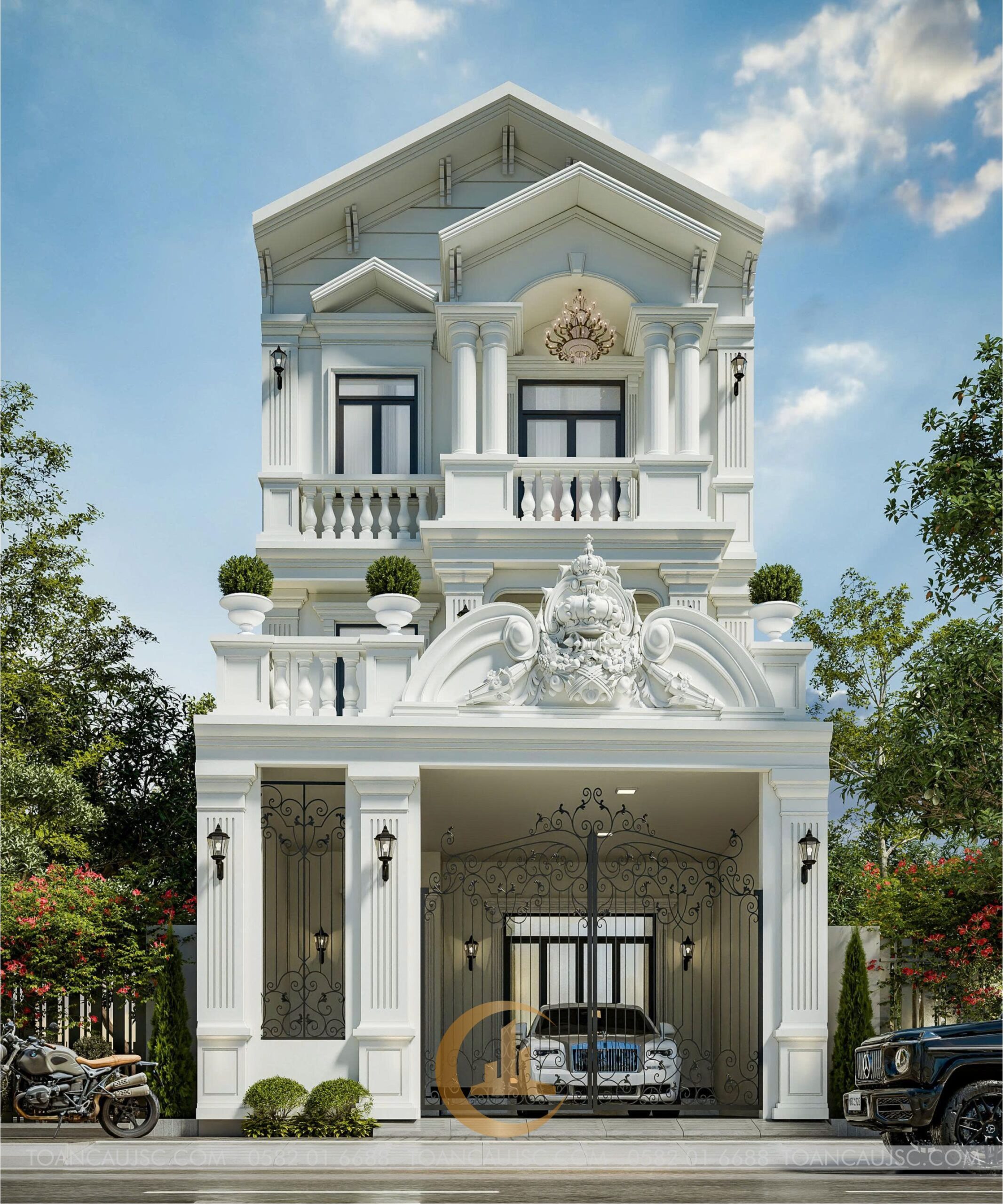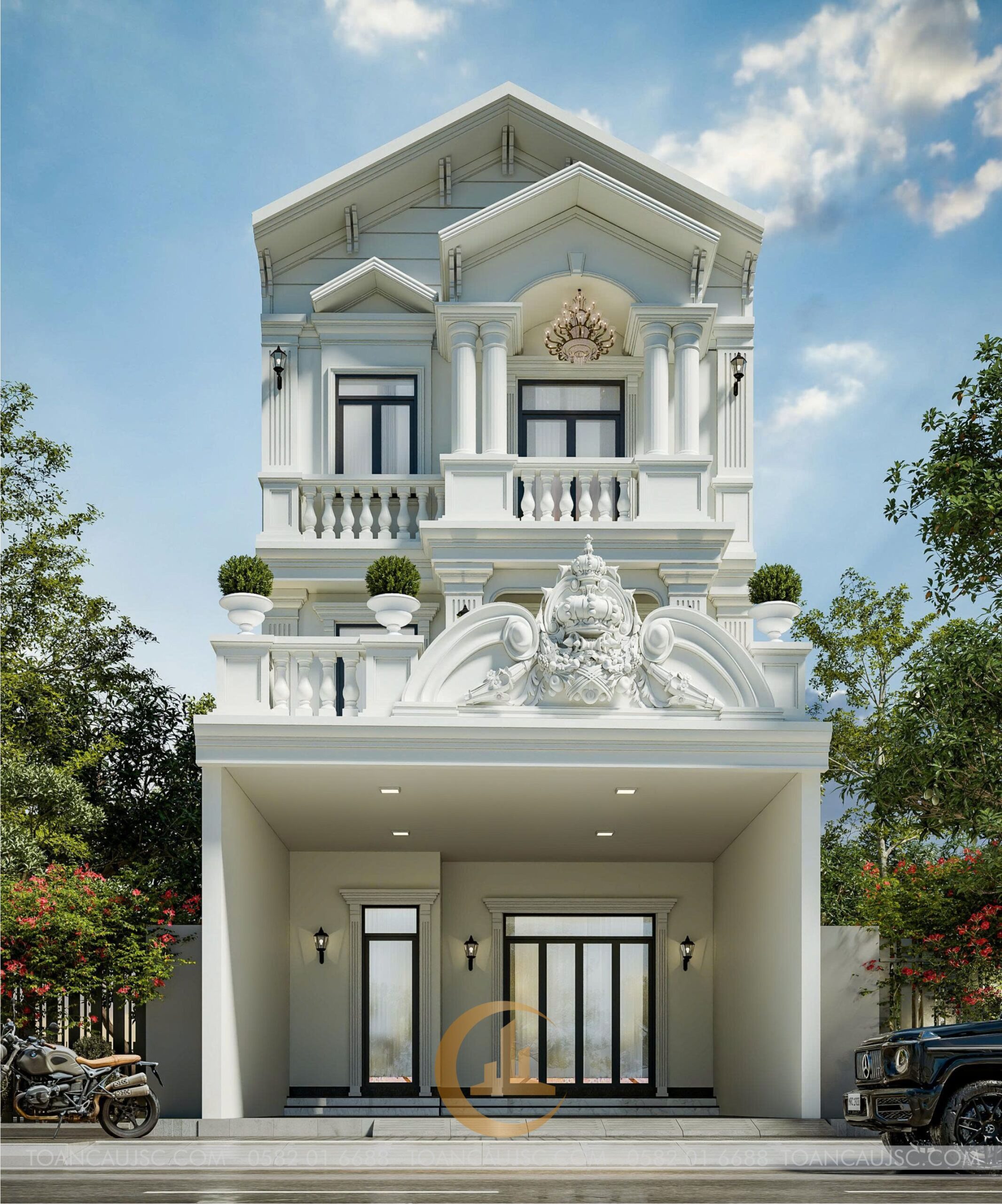 • Mặt tiền: Công trình sử dụng tone màu trắng sứ và các mảng ốp gạch (hoặc đá tự nhiên) màu ghi xám tại tầng 1 và cột trụ, tạo điểm nhấn vững chãi, hiện đại.
