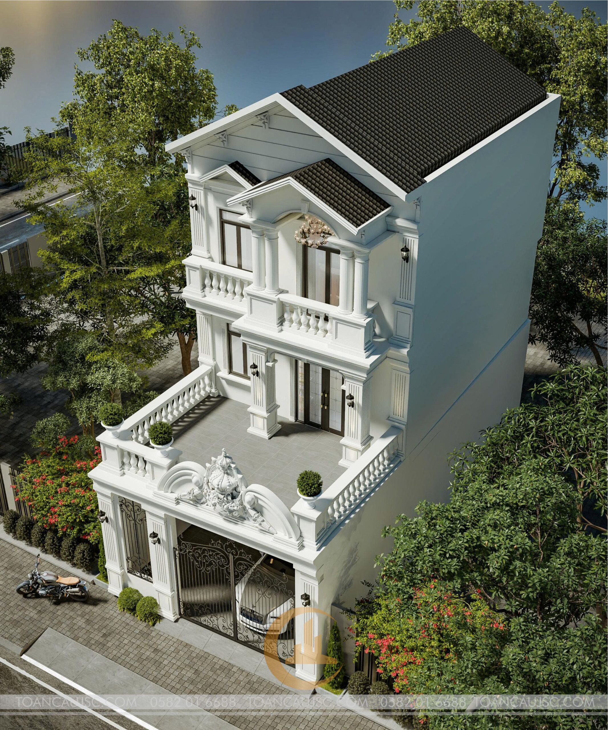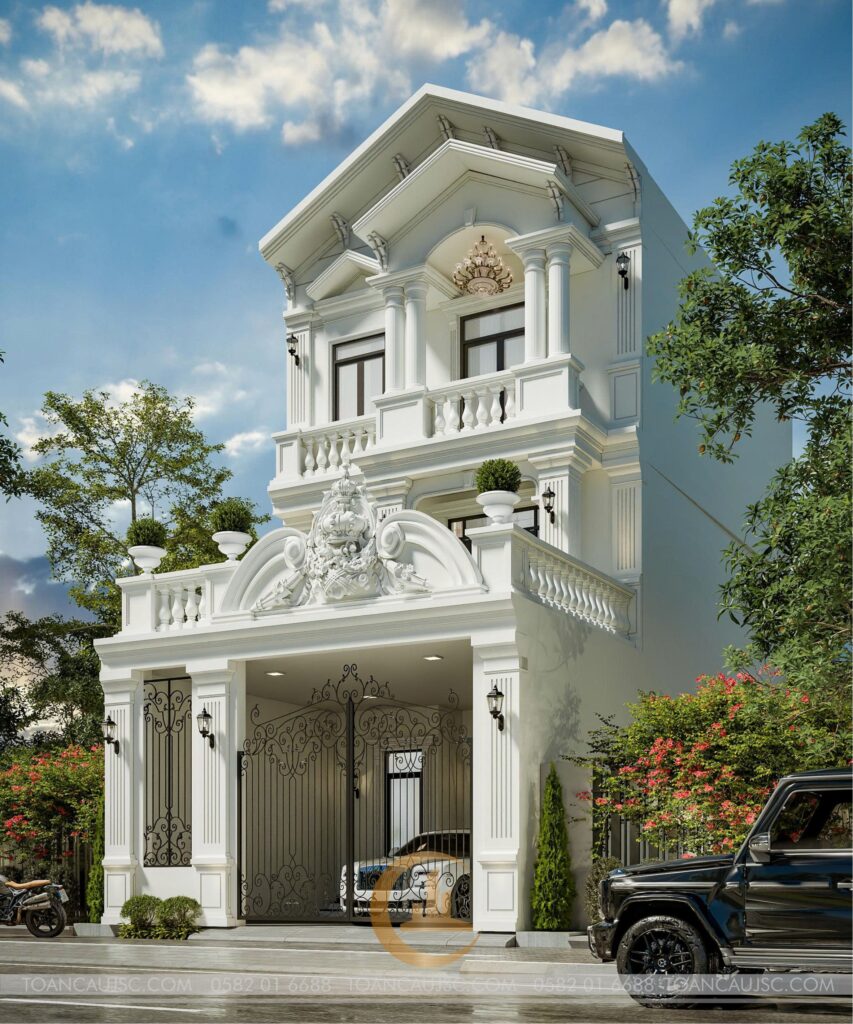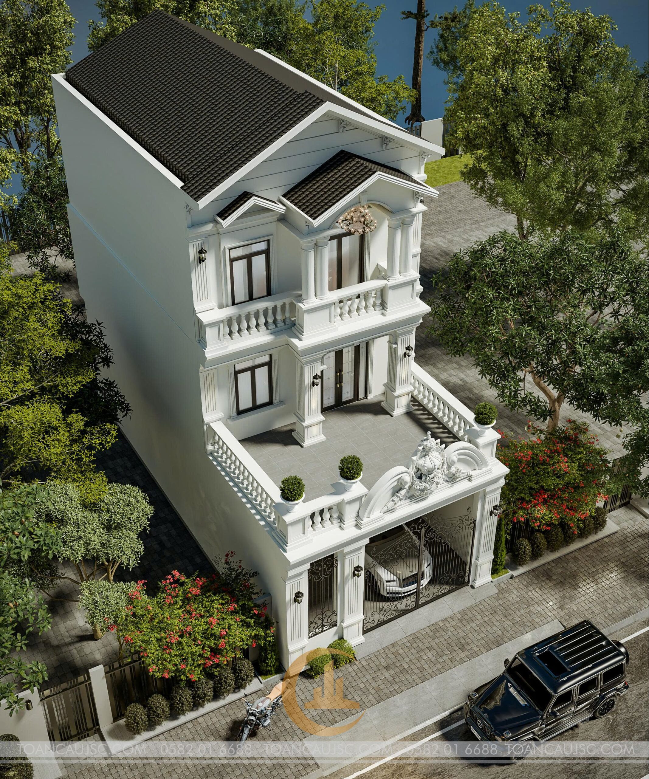 • Mặt tiền: Công trình sử dụng tone màu trắng sứ và các mảng ốp gạch (hoặc đá tự nhiên) màu ghi xám tại tầng 1 và cột trụ, tạo điểm nhấn vững chãi, hiện đại.