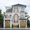 • Màu sắc: Biệt thự sử dụng gam màu trắng sứ trang nhã làm chủ đạo, kết hợp với màu vàng kem nhẹ nhàng và màu nâu trầm của mái ngói, tạo nên sự hài hòa tuyệt đối, làm nổi bật các chi tiết hoa văn.
