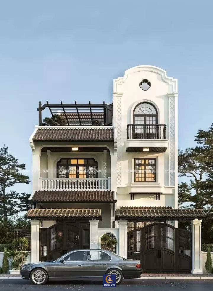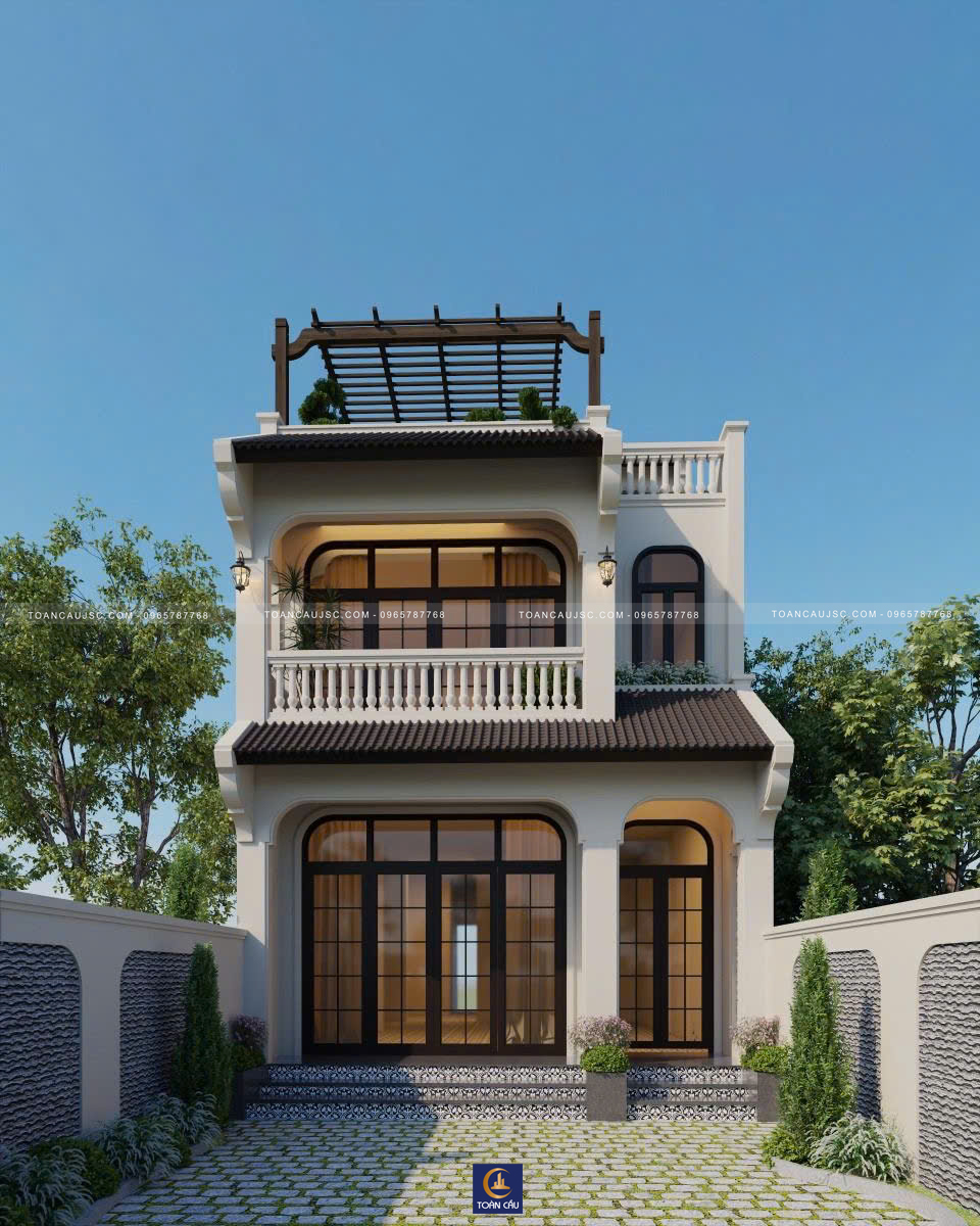 Mẫu thiết kế này là giải pháp hoàn hảo cho nhà phố cao tầng. Kiến trúc sư đã khéo léo sử dụng hệ mái vòm (Arched) xuyên suốt từ ban công cho đến các ô cửa sổ để tạo sự mềm mại.