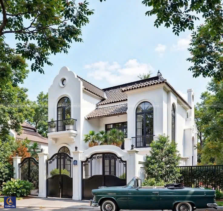 Cửa sổ: Hệ cửa vòm kính đen tương phản mạnh mẽ với màu sơn trắng, tạo chiều sâu cho mặt tiền