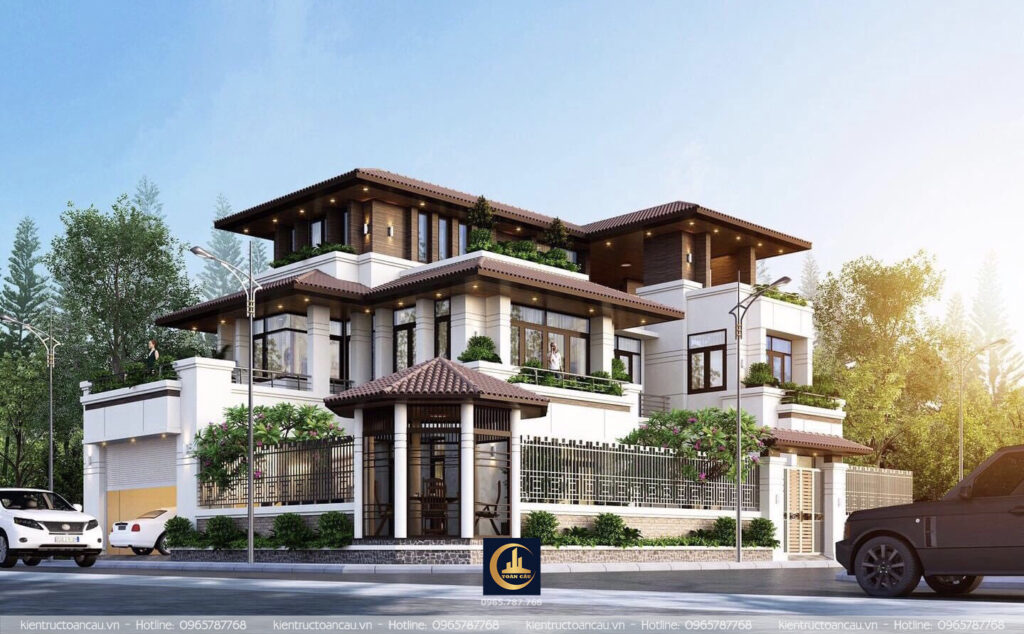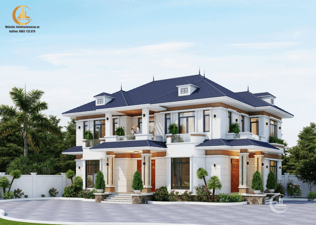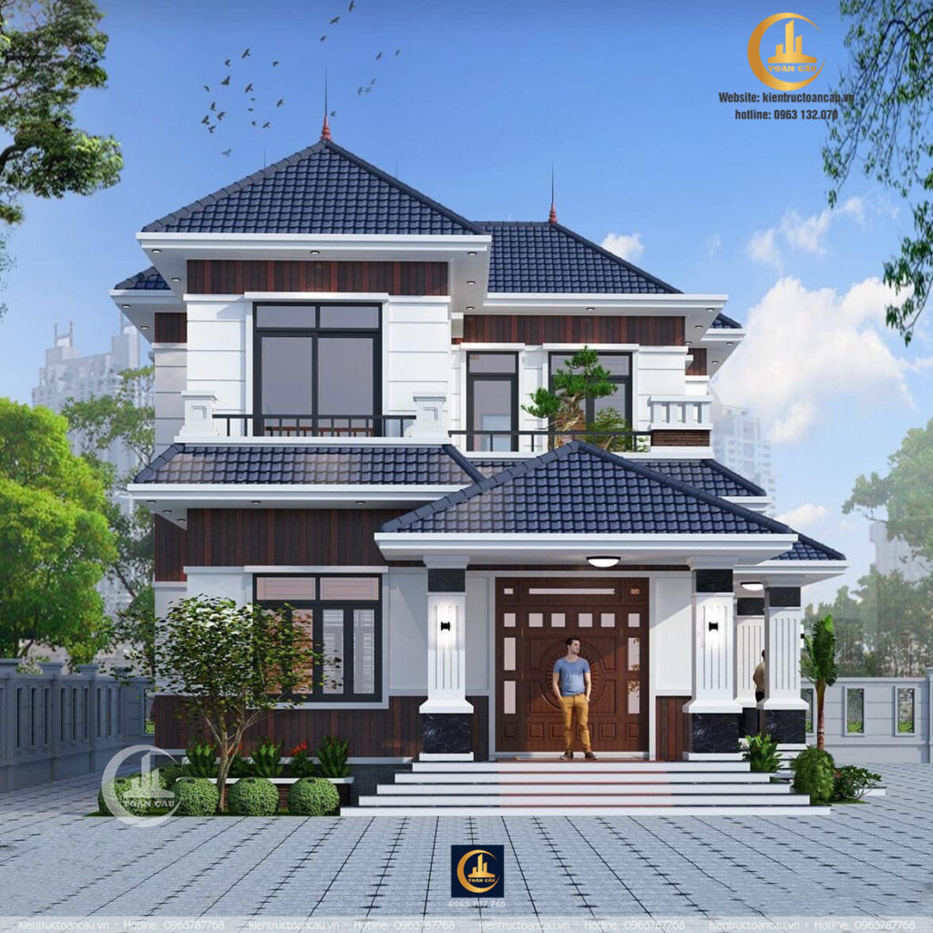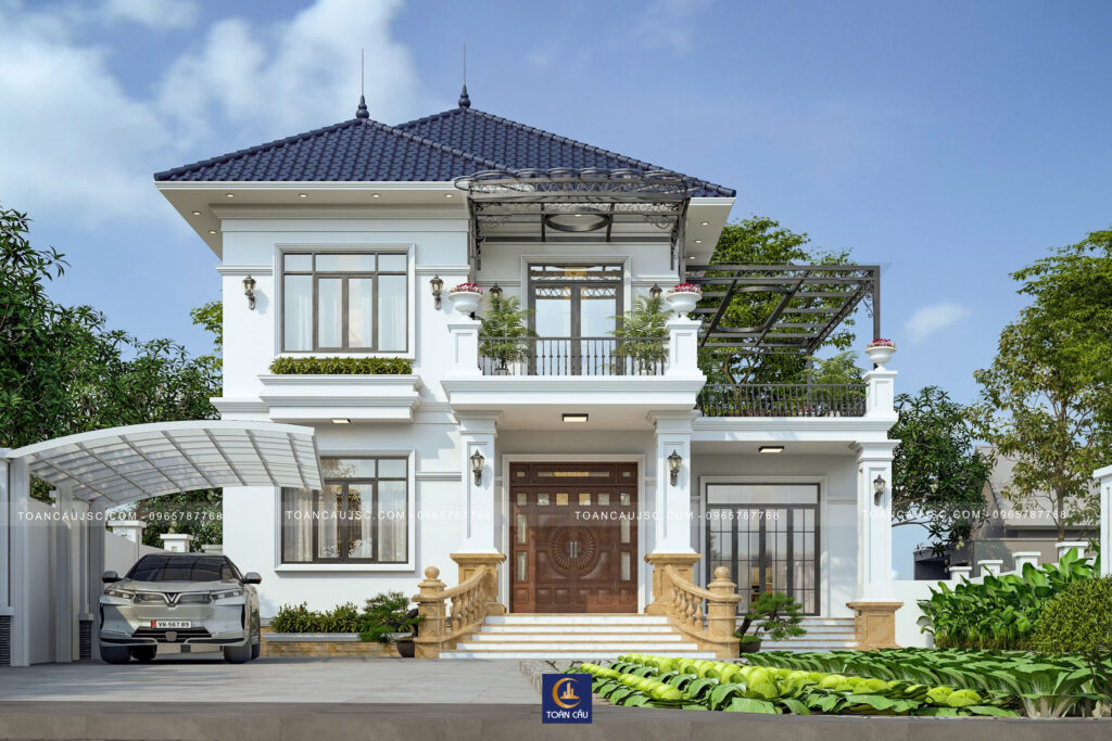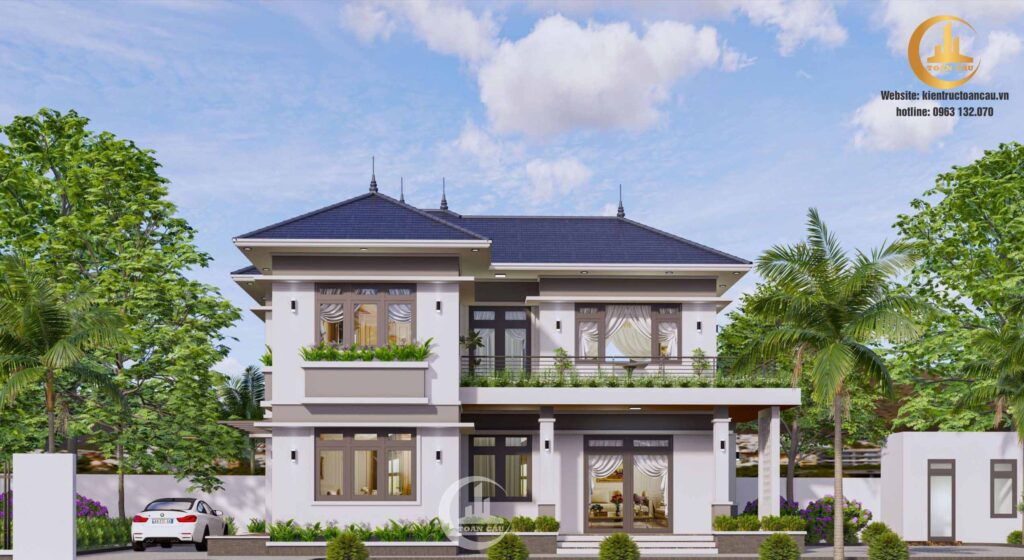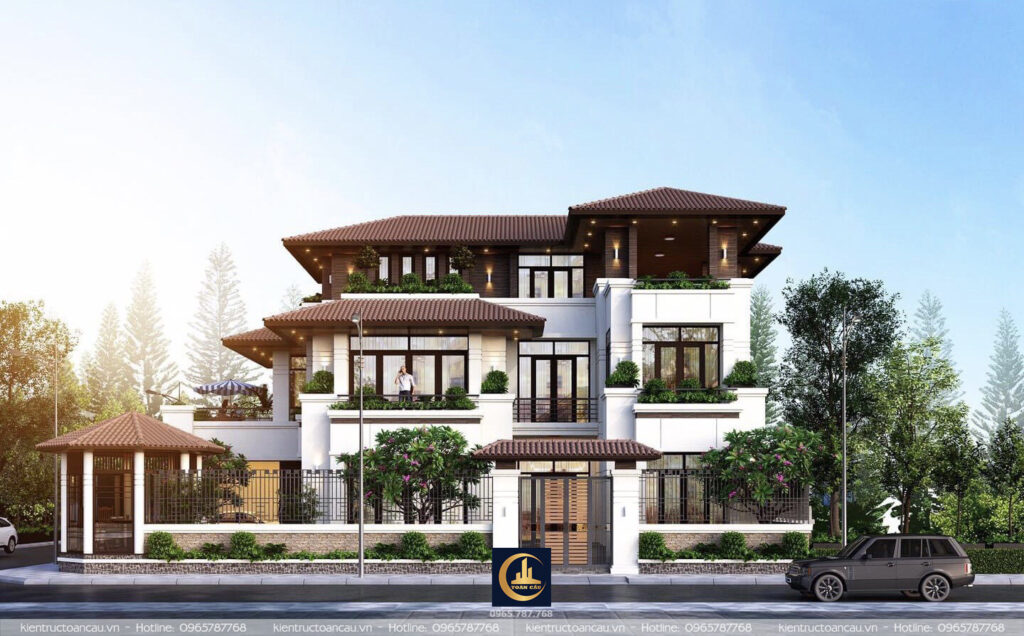 Đặc trưng: Công trình nổi bật với màu trắng sứ chủ đạo, hệ cột trụ vững chãi, phào chỉ được lược giản nhưng vẫn đảm bảo sự sang trọng. Hệ mái Nhật màu xanh than (hoặc nâu trầm) kết hợp với lan can sắt nghệ thuật mang lại vẻ bề thế, đẳng cấp.
