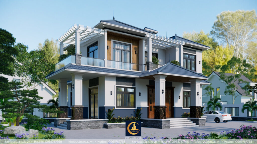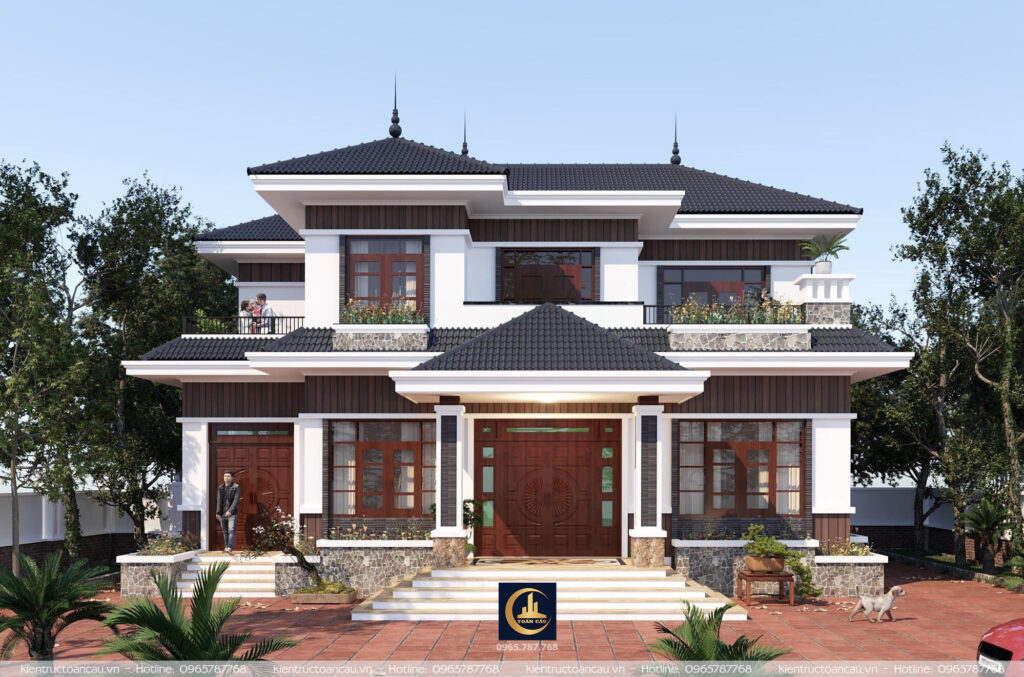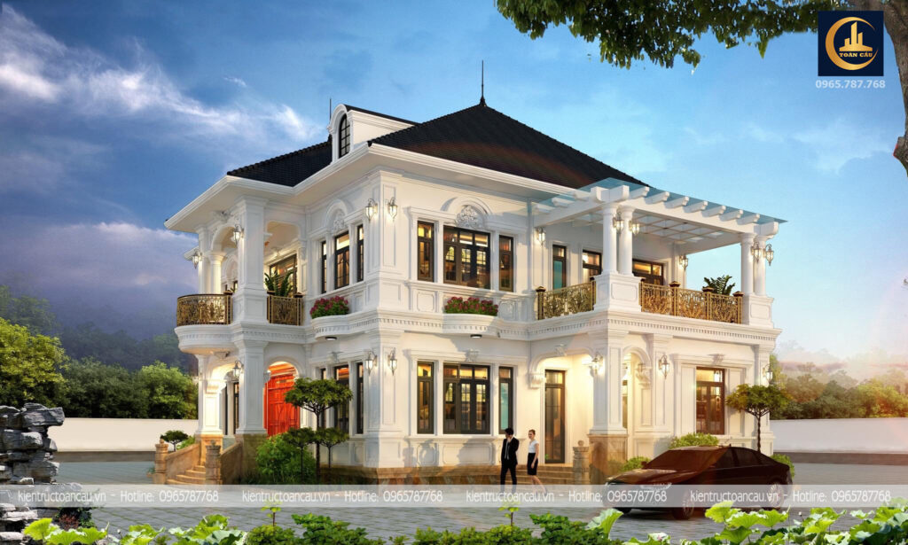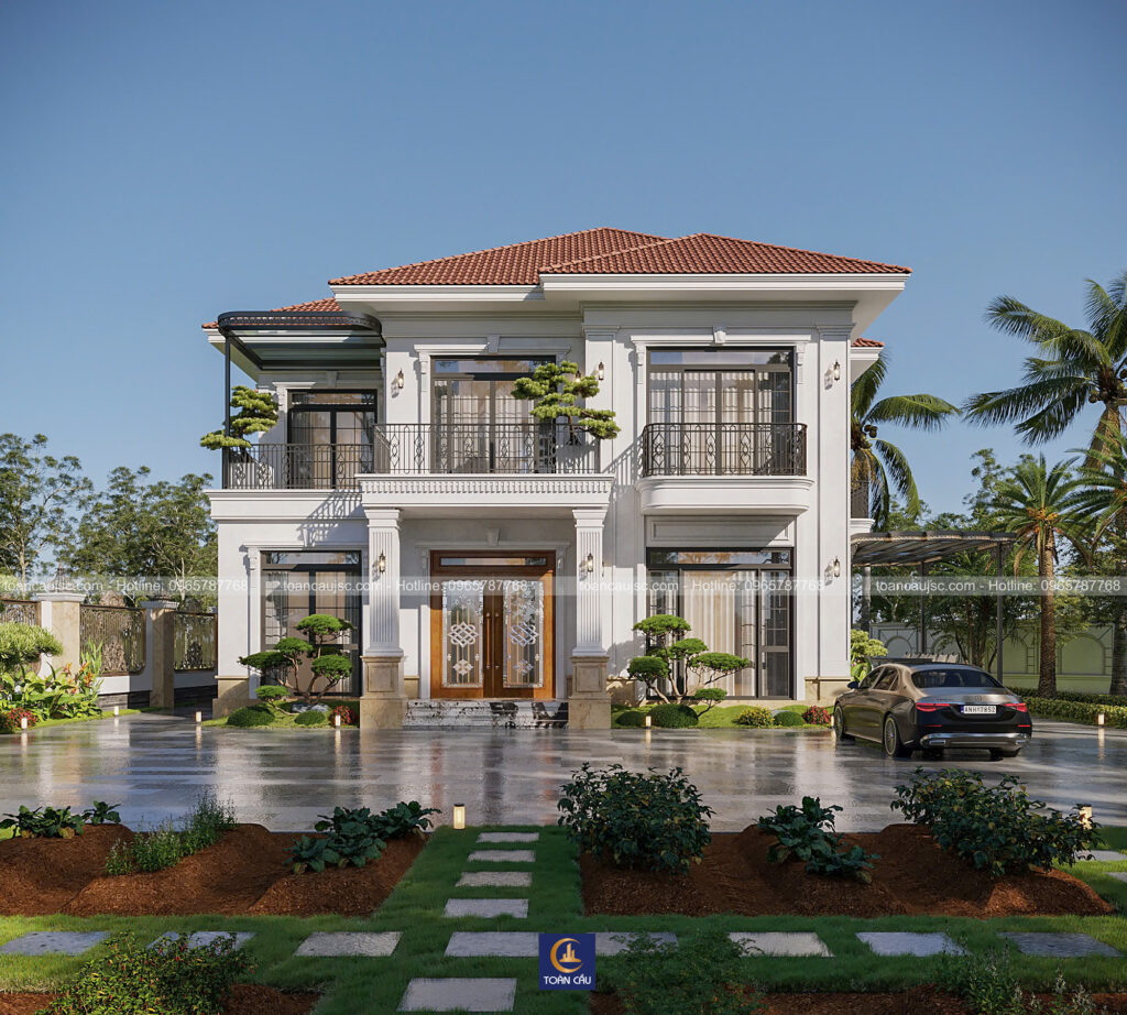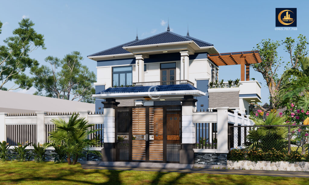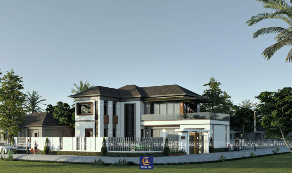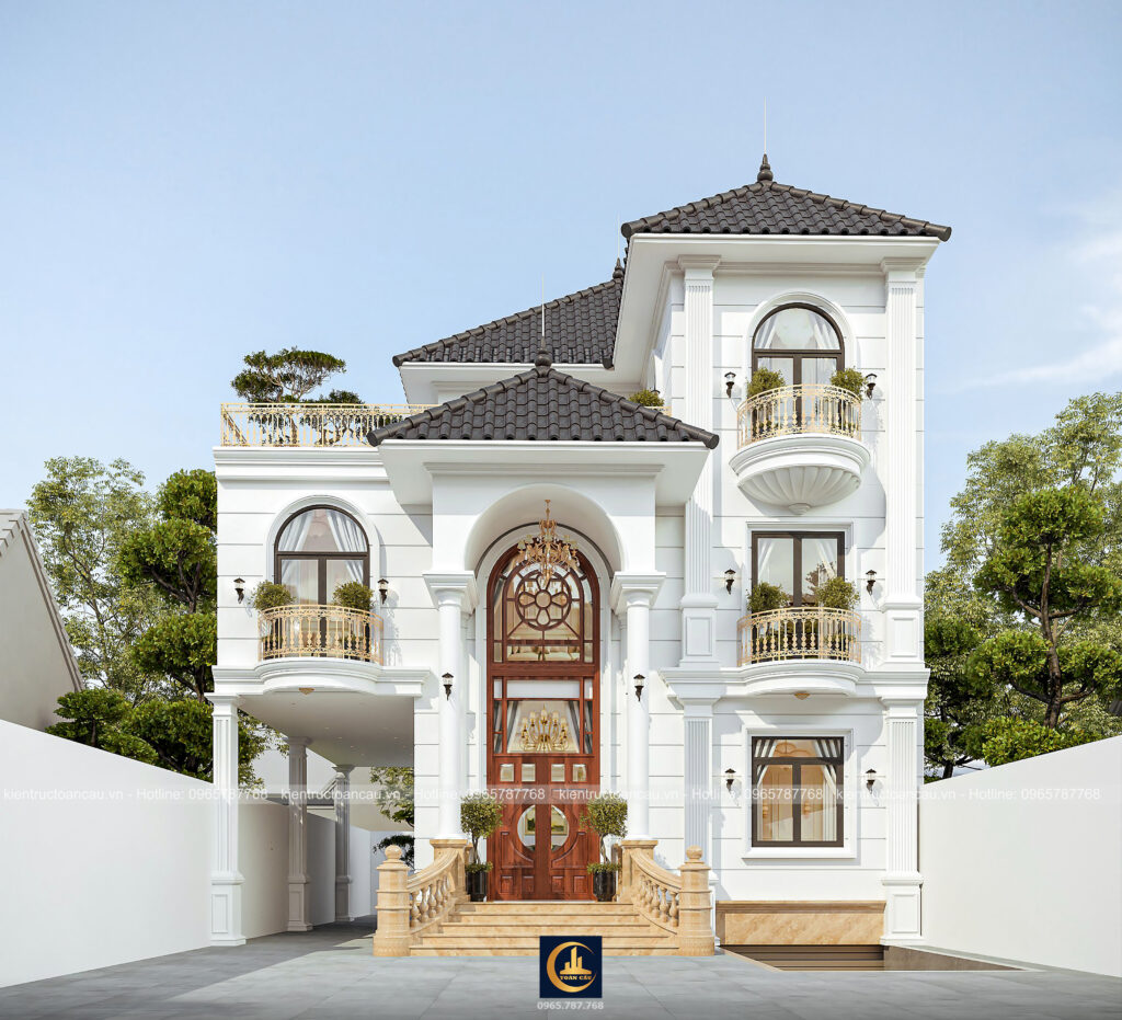 Đặc trưng: Công trình nổi bật với màu trắng sứ chủ đạo, hệ cột trụ vững chãi, phào chỉ được lược giản nhưng vẫn đảm bảo sự sang trọng. Hệ mái Nhật màu xanh than (hoặc nâu trầm) kết hợp với lan can sắt nghệ thuật mang lại vẻ bề thế, đẳng cấp.