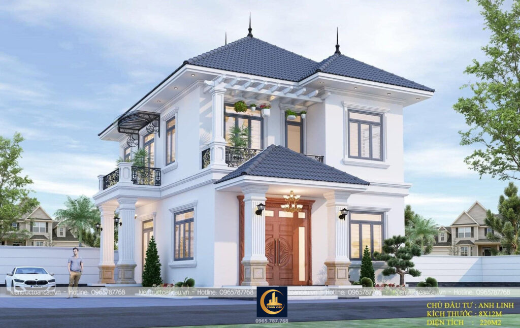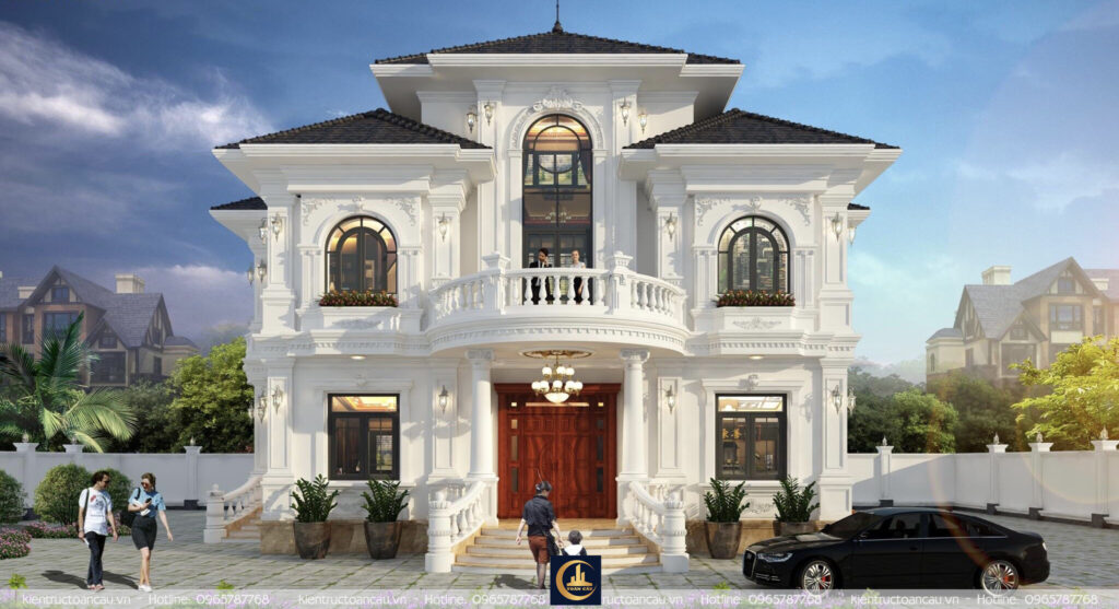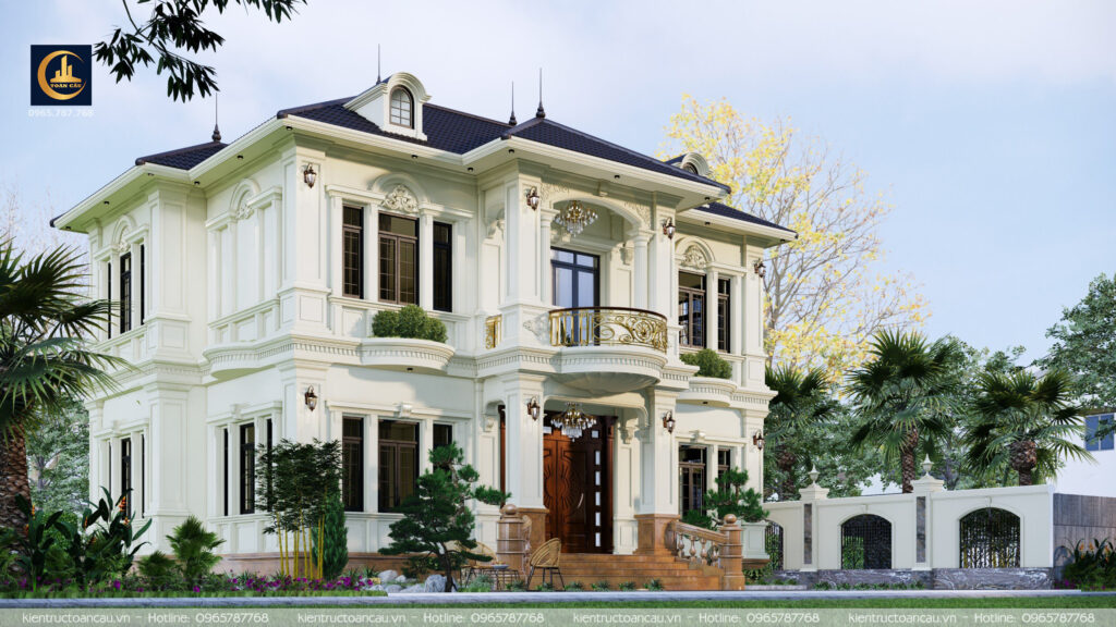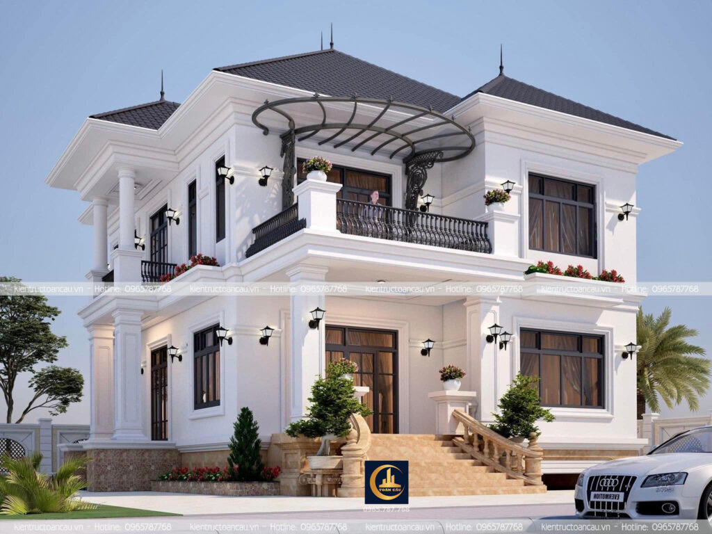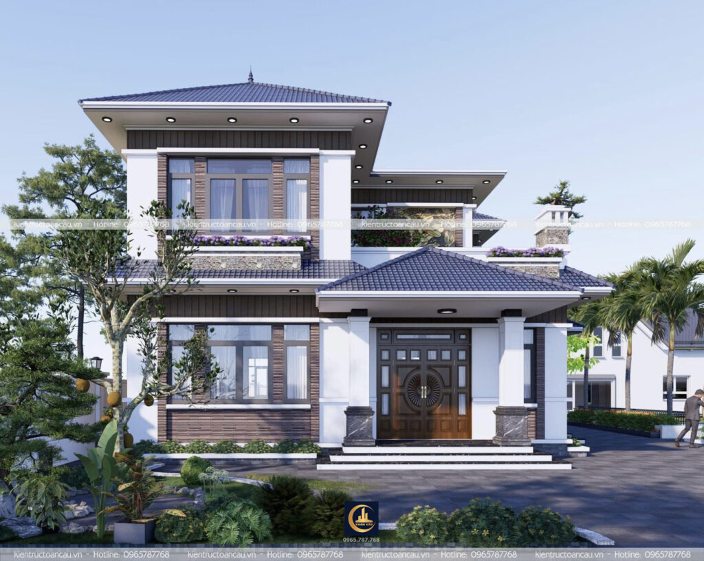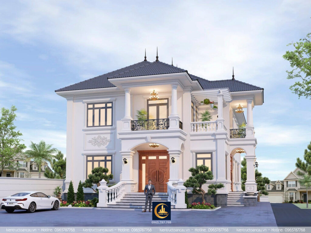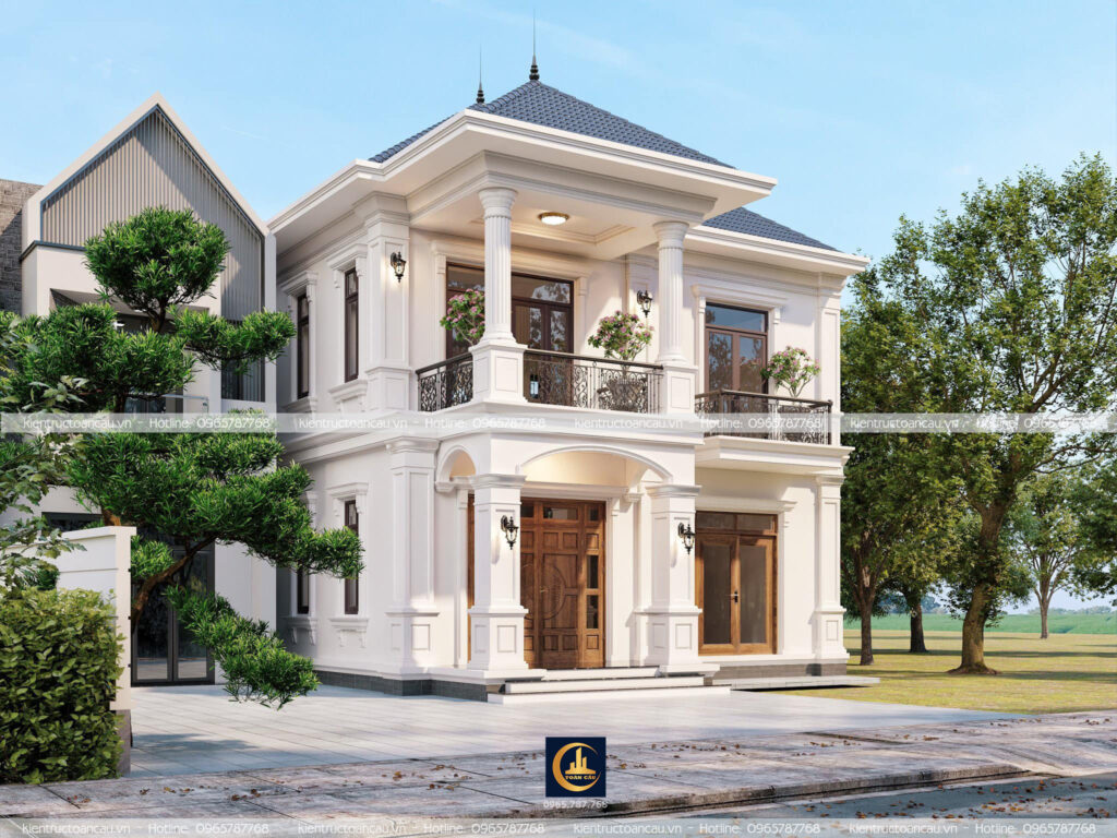 Đặc trưng: Công trình nổi bật với màu trắng sứ chủ đạo, hệ cột trụ vững chãi, phào chỉ được lược giản nhưng vẫn đảm bảo sự sang trọng. Hệ mái Nhật màu xanh than (hoặc nâu trầm) kết hợp với lan can sắt nghệ thuật mang lại vẻ bề thế, đẳng cấp.